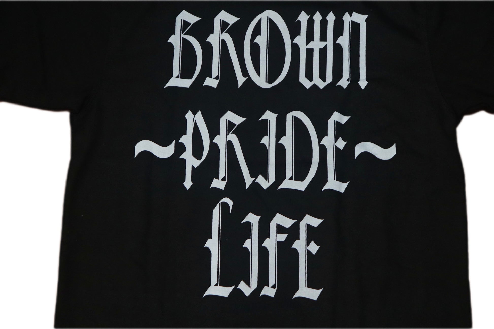 背中の大きな BROWN PRIDE LIFE スクリーン プリントが、大胆なプライドを表現しています。