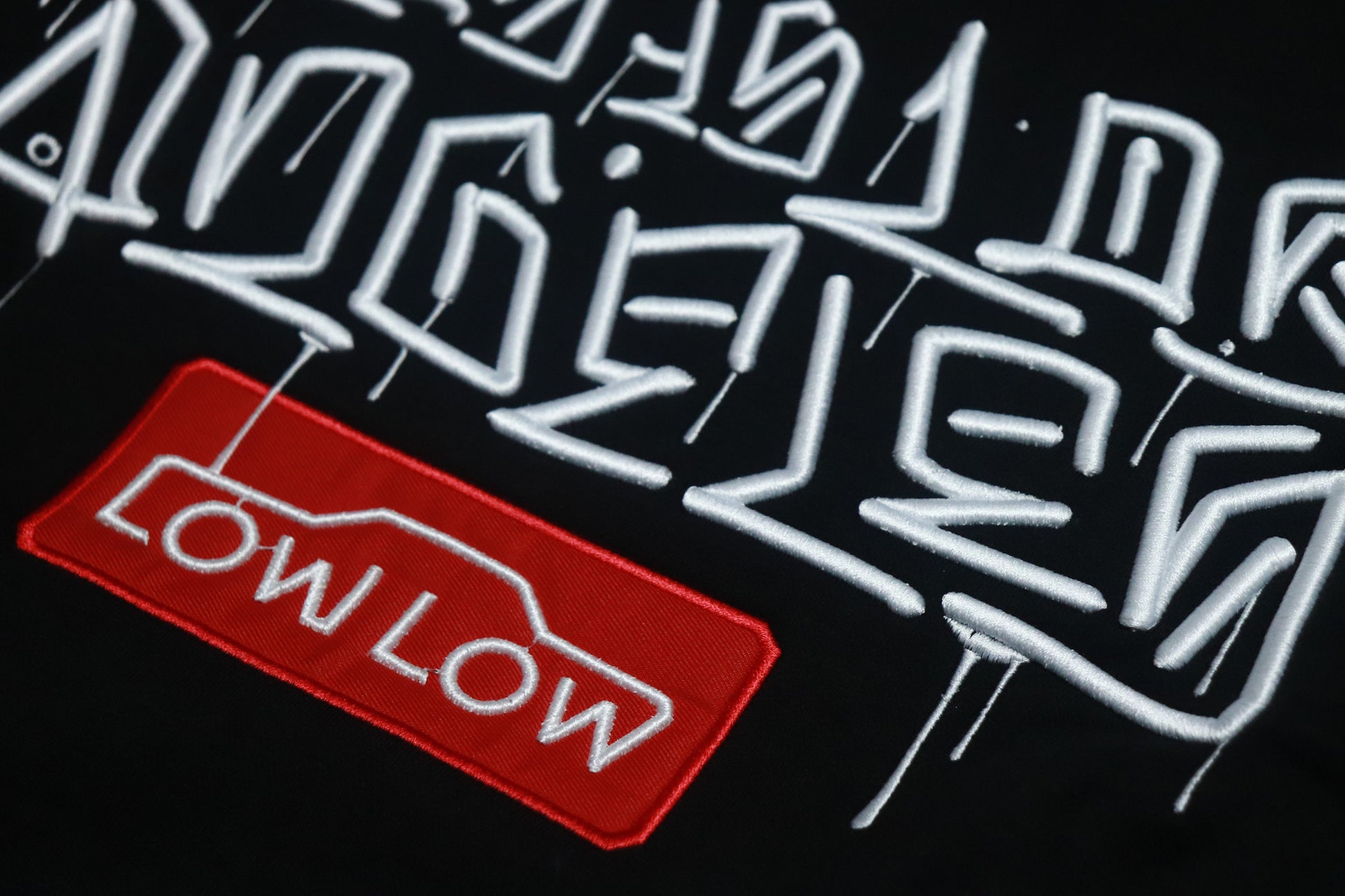 フードにはLOWLOW刺繍、バックにはL刺繍、フロントにはブランドロゴのワッペン刺繍、左腕にはラバータグといったひとつのhoodieにこんなにも拘って作っています。