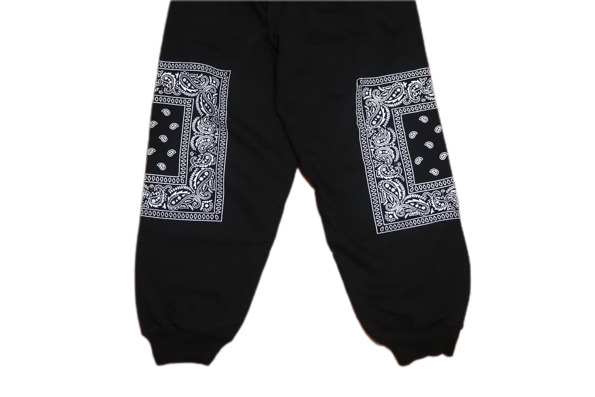 パンツはバックポケットにラバータグ、膝部分にバンダナプリント、左側に刺繍のブランドロゴ、そしてなんとサイドポケットにブランドロゴがプリントされています。