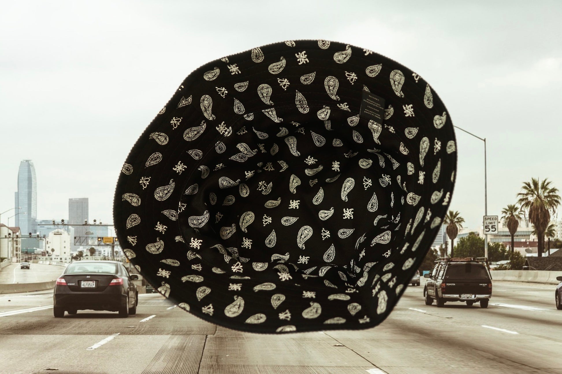 外側はブラックのコーデュロイに白の刺繍、内側は白いペイズリーがプリントされてインパクト絶大です。
